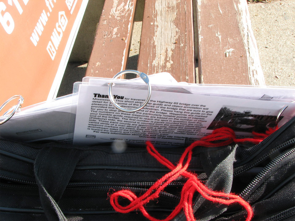 download file Here's the laminated maps with the ring binders (for ease of hanging) and the red thread. Just before I hung these, a late-middle-aged woman was walking by and I said "I've made a walking guide to the bridge! Would you like one?" The answer was, of course, a harsh "no!" and an accelerated stride. |