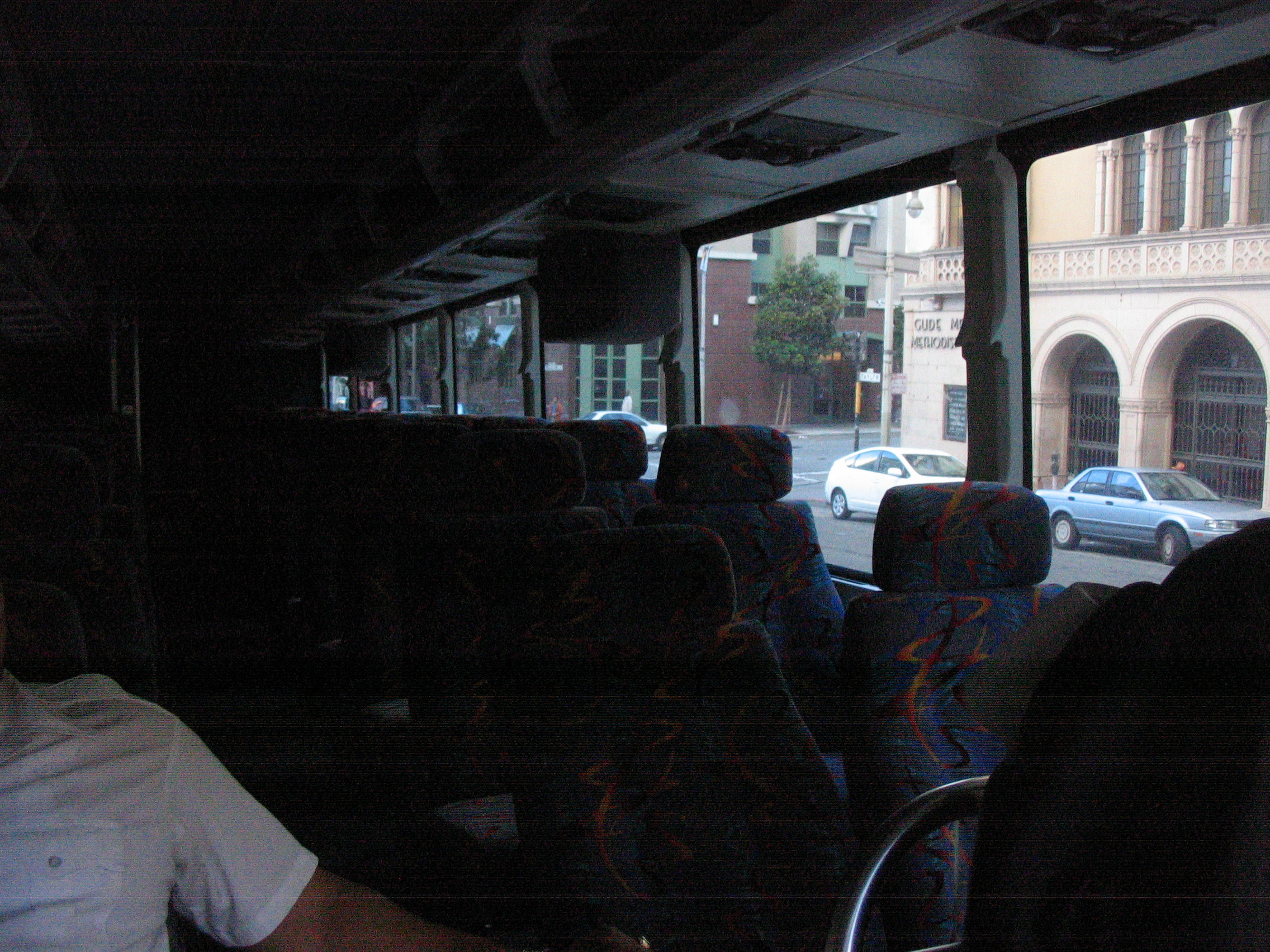 I found a bus parked in front of a hotel. I found the doors (which were opened) and talked to the driver for a bit. He was relaxing and said I could take a picture. It was a cool bus.