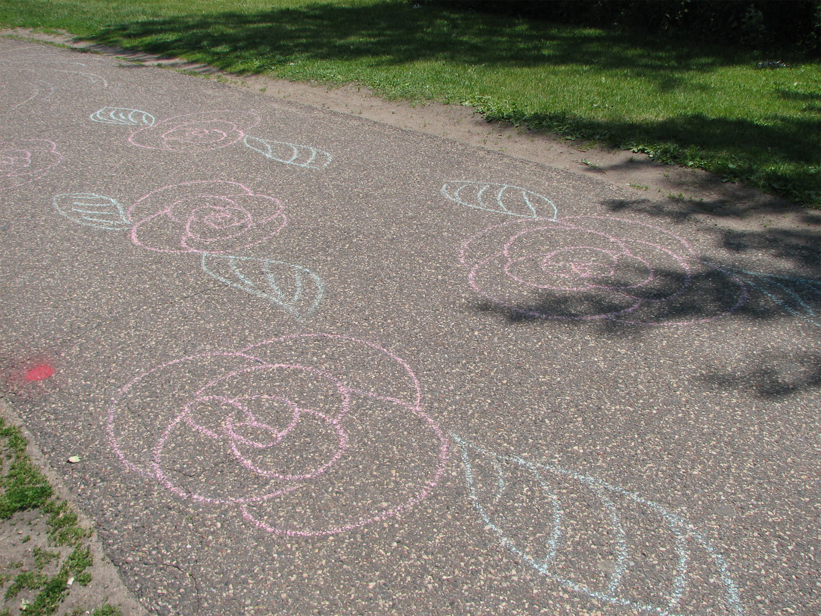 Big roses sprawled across the pavement eventually attracted a giant green caterpillar.