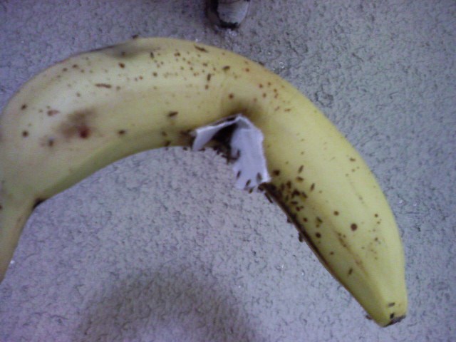 Fruit flies are hangin' on the bottom of the banana, to drink up the rotten juices that are seeping from the hole in the bottom.