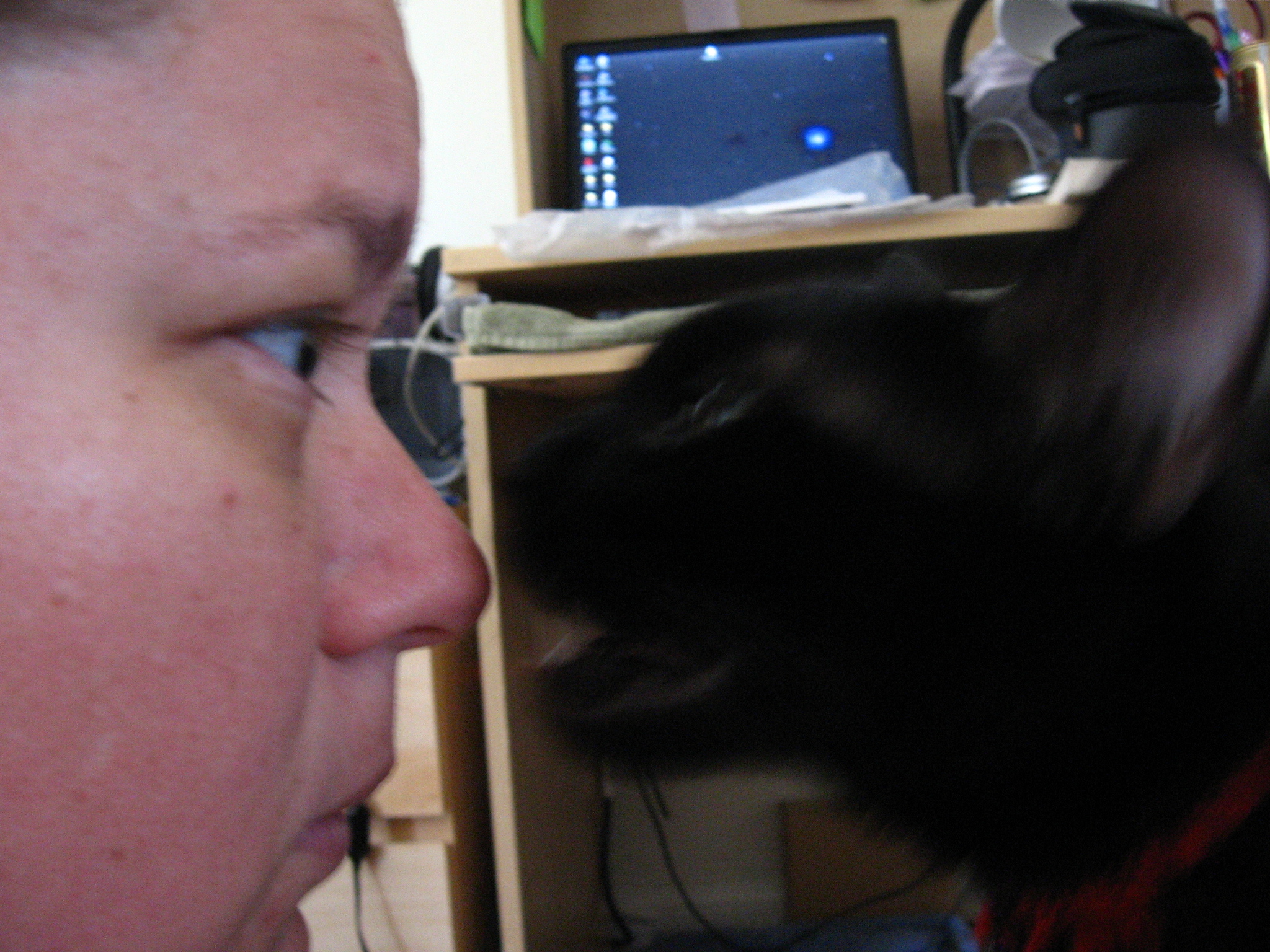 Going for the nose again. I don't speak when he's chewing on my nose because he's chewed on my lip and stuck his tongue on my tongue when I do that. Not so much in to frenching the cat.