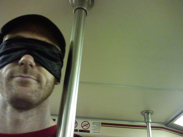 Me on the train. Feeling the movement of the train while blindfolded is really cool.