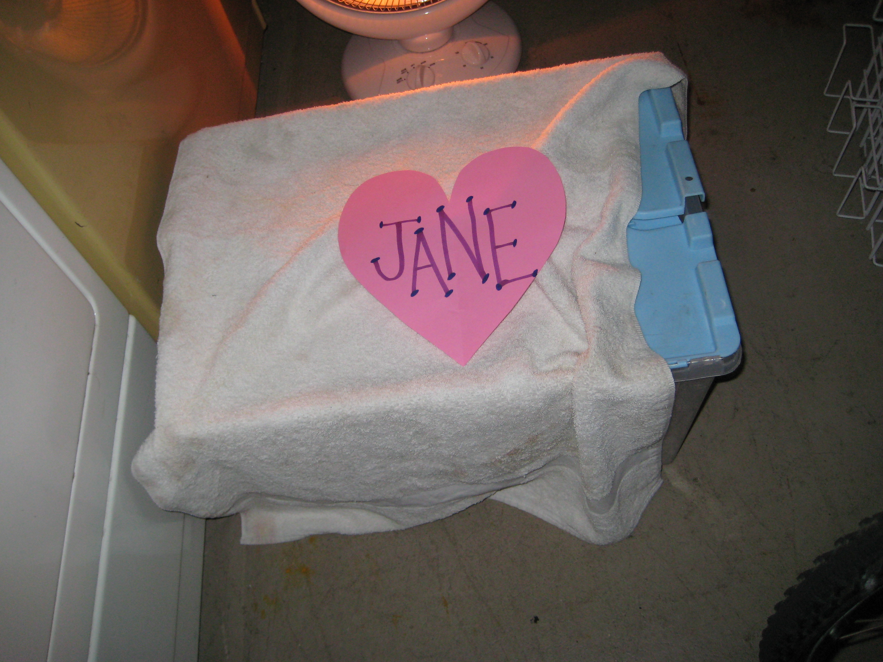 We decided that he was a bit scared on top of the washing machine so we moved him to the ground and gave him a little love note.