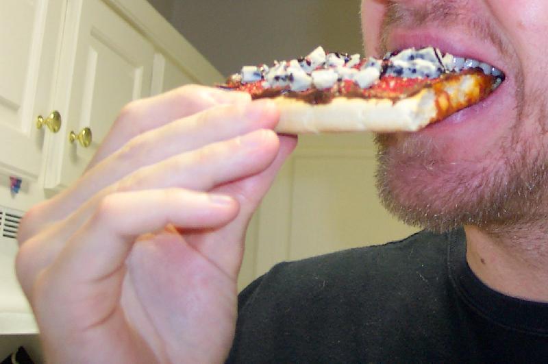download file Bad combinations: the thin layer of pizza sauce below the chocolate frosting and chocolate sauce sets off adverse chemical reactions with the cinnamon sprinkles. Also, note to future chefs: be more complete when scraping off the cheese from an adjacent slice. Cheese and chocolate = not a party in my mouth. |