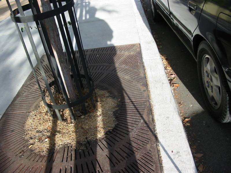 With a shadow that is me. (Actually meant to be a photo of the interesting-to-step-on iron grille and tree cage with eye-level metal spikes protruding from it.)