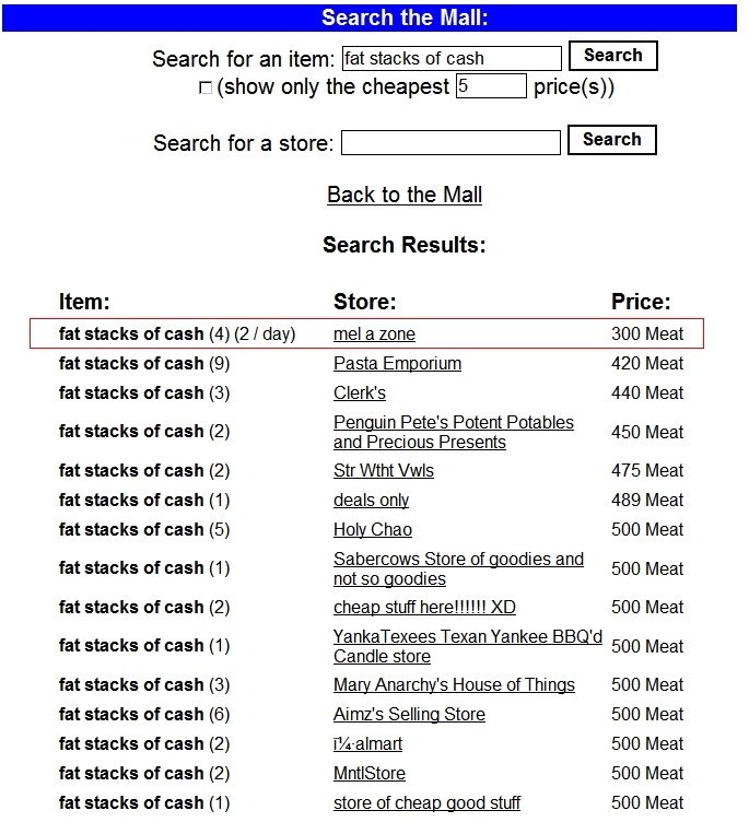 Here, I am searching the Mall, where you can buy items from other players. The item I will buy: Fat Stacks of Cash. A totally useless item in-game.
