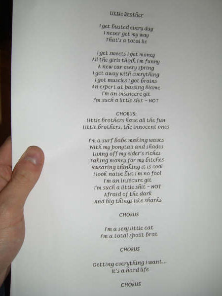 download file The first verse of this song ("Little Brother") goes: "I get busted every day - I never get my way - That's a total lie - I get sweets I get money - All the girls think I'm funny - A new car every spring - I get away with everything - I got muscles I got brains - An expert on passing blame - I'm an insincere git - I'm such a little shit - NOT." Sheer genius. |