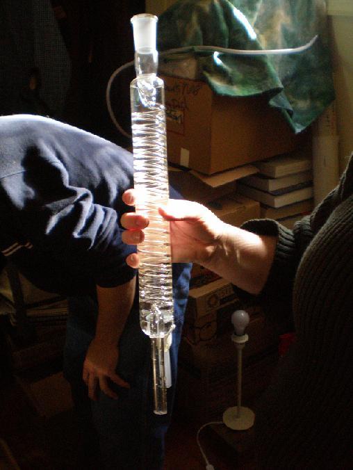This is the condenser. The steam goes into the little spiral tube and condenses into liquid there, because cold water sits in the space around it, force-cooling the whole thing. It's pretty.