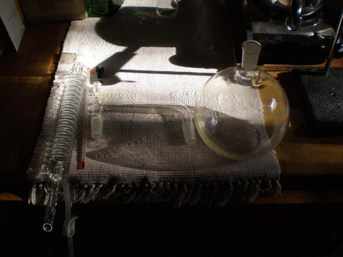 condenser, thermometer and gasket, 24/40 adpater, 2 L florence flat bottom flask, all fashioned from borosilicate glass.