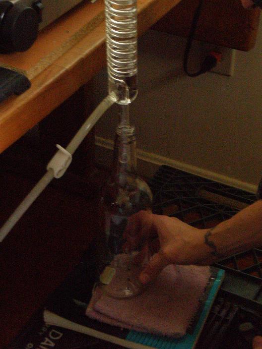 Put a graduated bottle under the condenser as a receiver to catch the alcohol!
