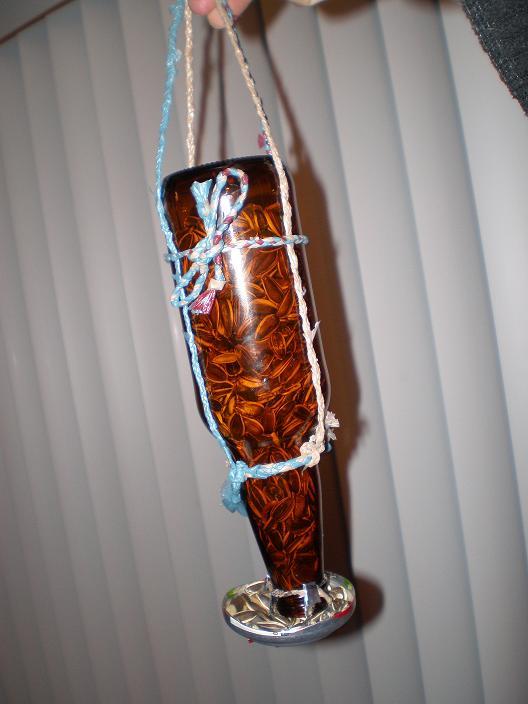 Here's the first version of the feeder. As you can see, I was using big sunflower seeds. They got stuck in the neck. Also, the way I had the bowl attached was simply not going to hold.