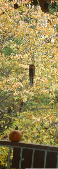 Here's the feeder hanging off my patio-thing. No birds using it yet.