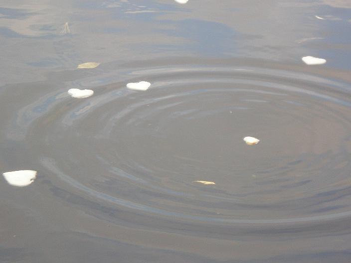 She has been throwing hearts made of bread into the water for a while, now, and nobody's eating them. But they're pretty.