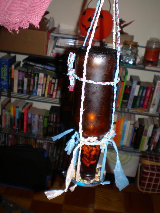 download file Here's the bottle, v2, finished and brought in from the (obviously rather cold) porch. Check how low the seeds are! I've been feeding birds! Also, I trimmed those "tails" on the bowl-holders, but I forgot to take another picture afterwards (for which I feel silly). |