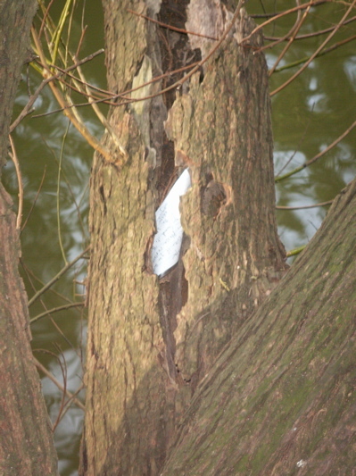 download file I was fascinated by this tree with an intricately cracked limb. Such a good hiding place. Unfortunately the paper unraveled between when I hid it and when they found it, so they got it pretty quickly. |