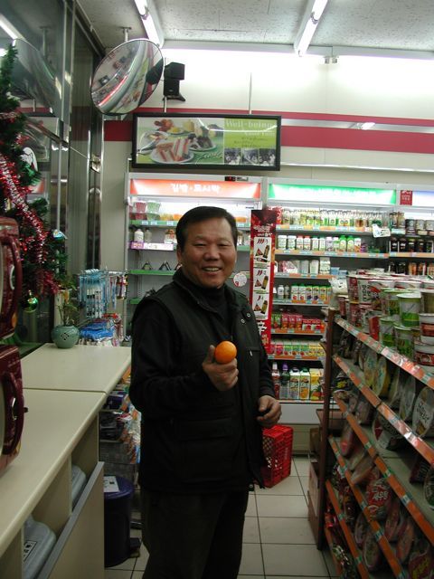 The ajushi first, the paper lady then, Another ajushi on the way to her friend's. More fruit for a foreigner, a look of great shock, Then for the workers who were still on the clock.