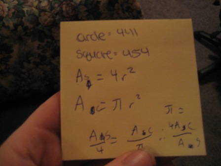 download file Crappy calculations. Messed up my variables at first. As=4r^2;Ac=(pi)r^2; solve for r^2 and you get As/4=Ac/(pi); solve for pi, 4Ac/As. Which according to the calculator is in this case 3.89! Not bad for dog kibble as Lauren said. |