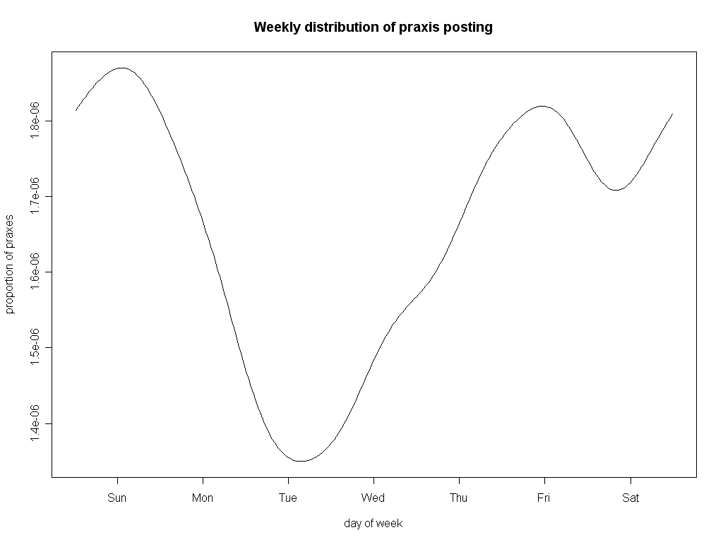 This shows when during the week praxes are most likely to be posted. Tuesday is surprisingly low.