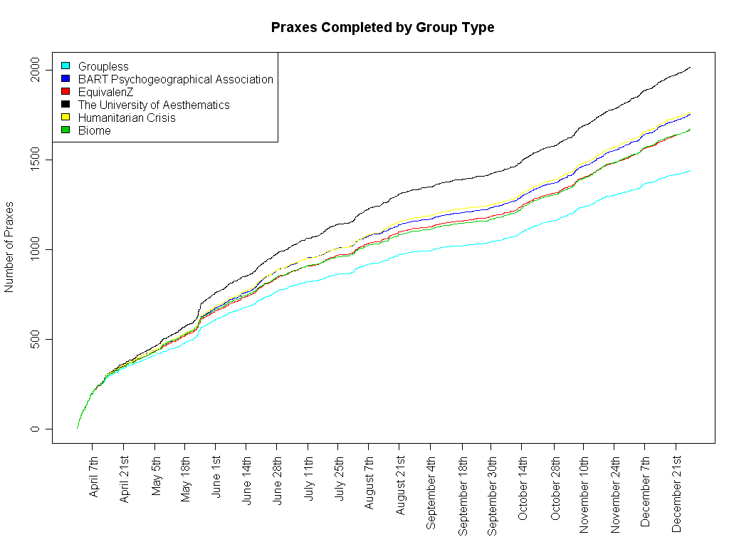 download file I also examined the praxes, to see how many group-specific tasks were being completed. This is a graph showing how the number of tasks requiring a certain group to complete are growing, over time. Only groupless tasks are counted in the groupless line, but anything which requires more than one group will be listed for all of those groups (for example, Pavlov It!, when posted, counts for both Equivalenz and Humanitarian Crisis) This graph is probably not that useful, as it's not really clear what's being measured. However, it's interesting that any individual group is having more tasks completed than groupless tasks being completed. |