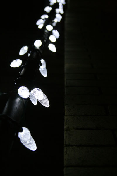 Lights on a railing which were brilliant blue, but awfully bright in contrast to the enveloping darkness around.