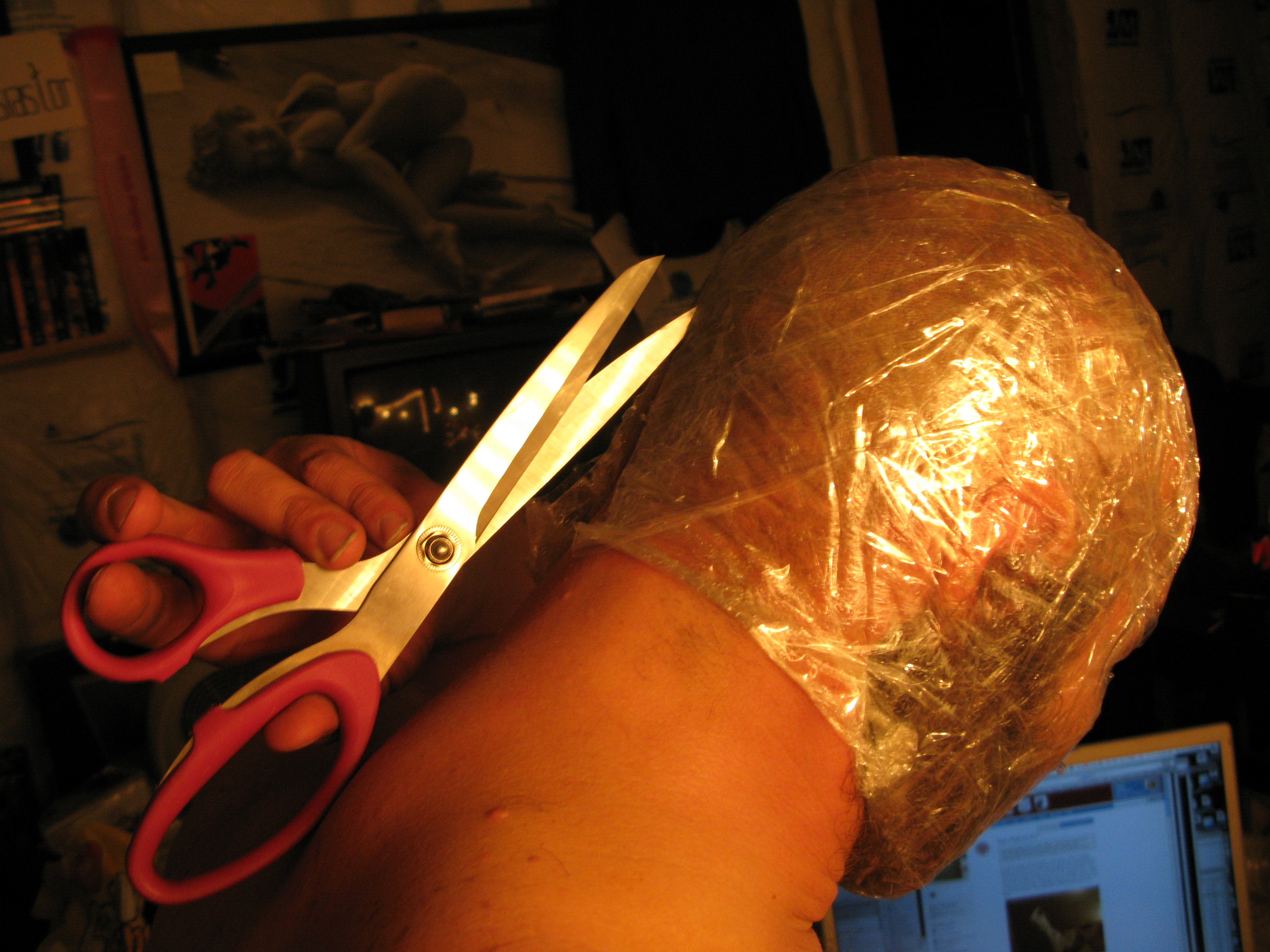 Once the head has been wrapped enough, it's time to cut the tape to extricate the head.