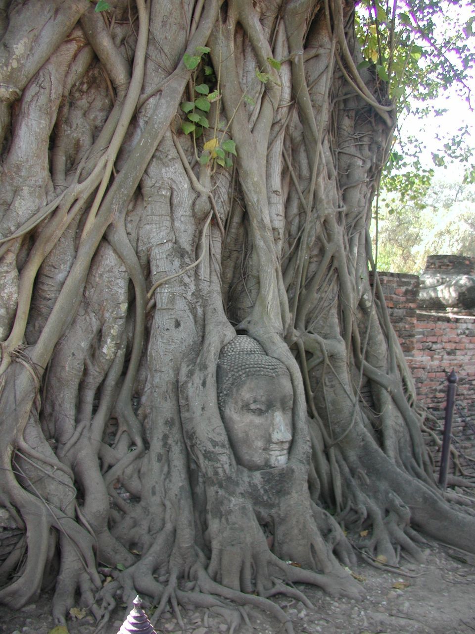 download file This is a particularly famous site in Ayutthaya. The temple where this Buddha head is located was burnt to the ground during one of Thailand's wars with Burma. The head was removed from a Buddha statue but was to heavy to drag very far. Much of the ruins were taken over by jungle before being rediscovered and by that time this particular head was in the embrace of a large, beautiful tree. |