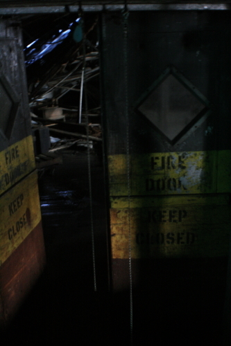 This door says "Fire Door" on it. It also had some weird small chains hanging from the door frame. I went around them.