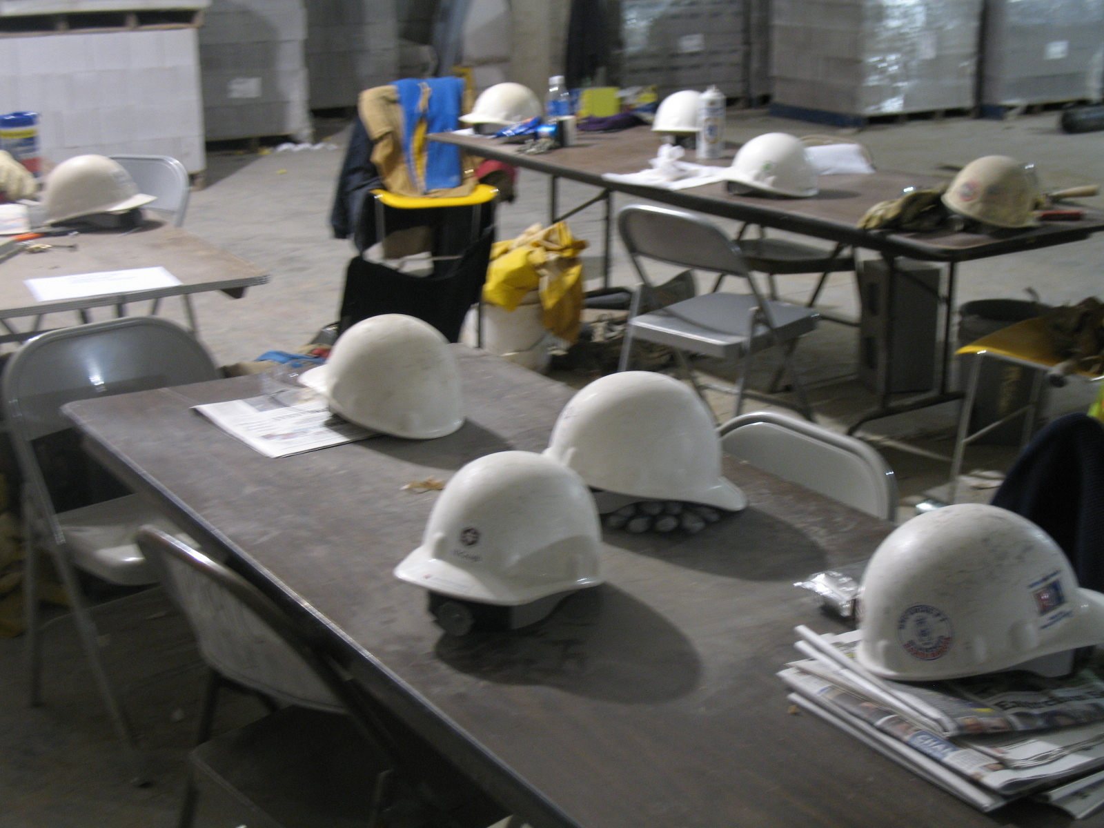 All of the worker's hardhats, presumably where they'd left them that afternoon.