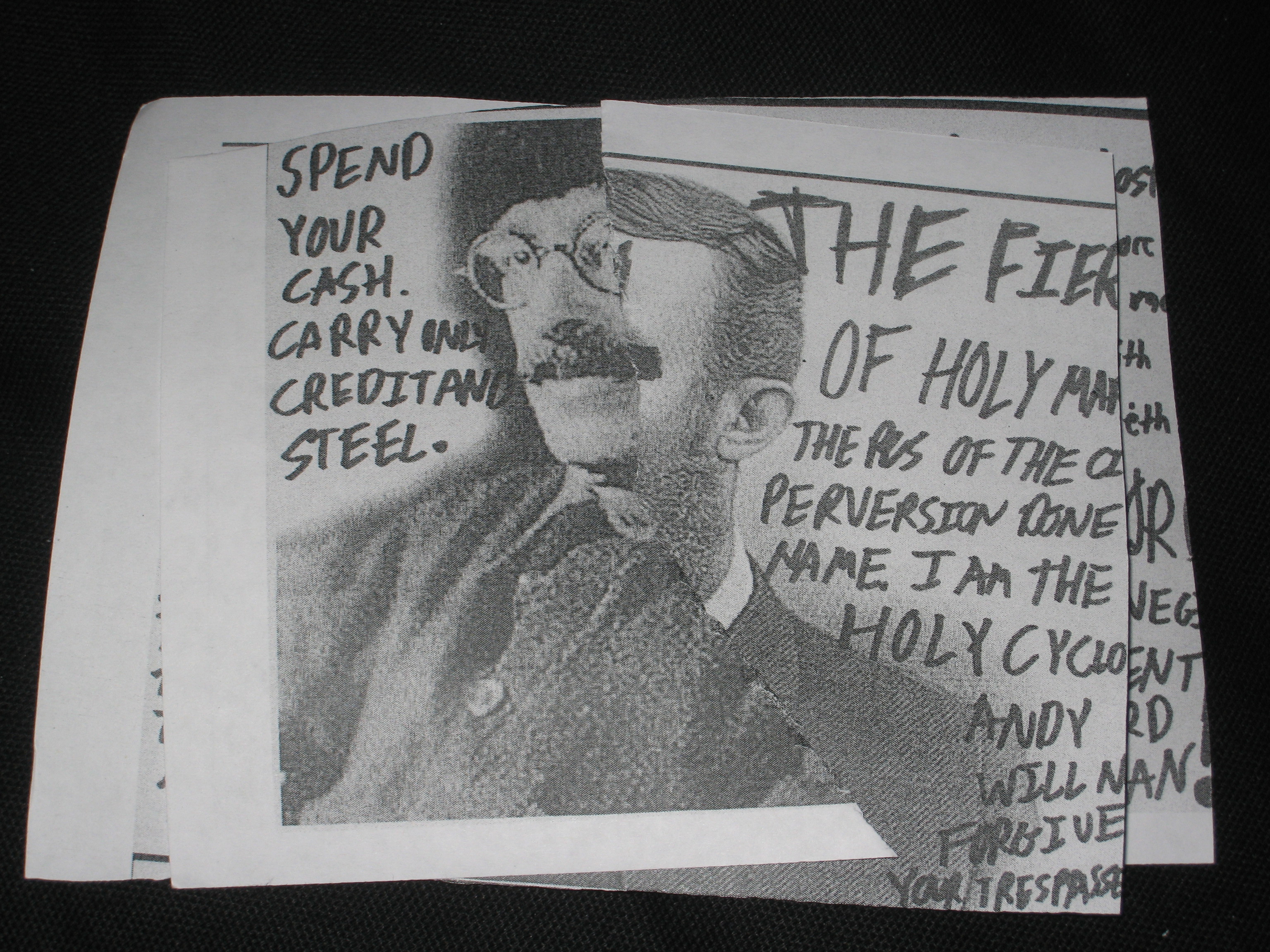 download file I then made cuts in all of the hundreds of little fliers and began slipping them together in pairs. Each card is now a mashup (split text) of two different ones. They may be pulled apart to be read, or left together as a sort of strange amalgamation. |