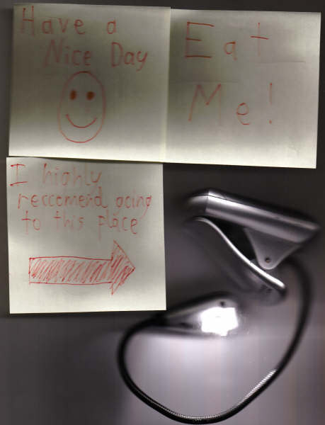 These are the other sticky notes I wrote and placed during my walk as well as the reading light I used to give me light so I could write out the sticky notes on location.