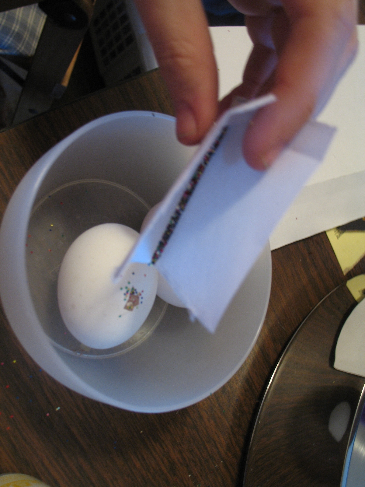 Here I am, pouring glitter into the tiny hole. I spilled a lot of glitter, which had to be swept up.