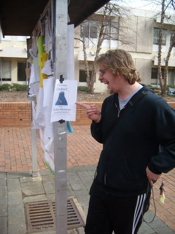 cookie monster stayed on the message board, and a passerby enjoyed it greatly! (we asked him to reenact it for emphasis.)