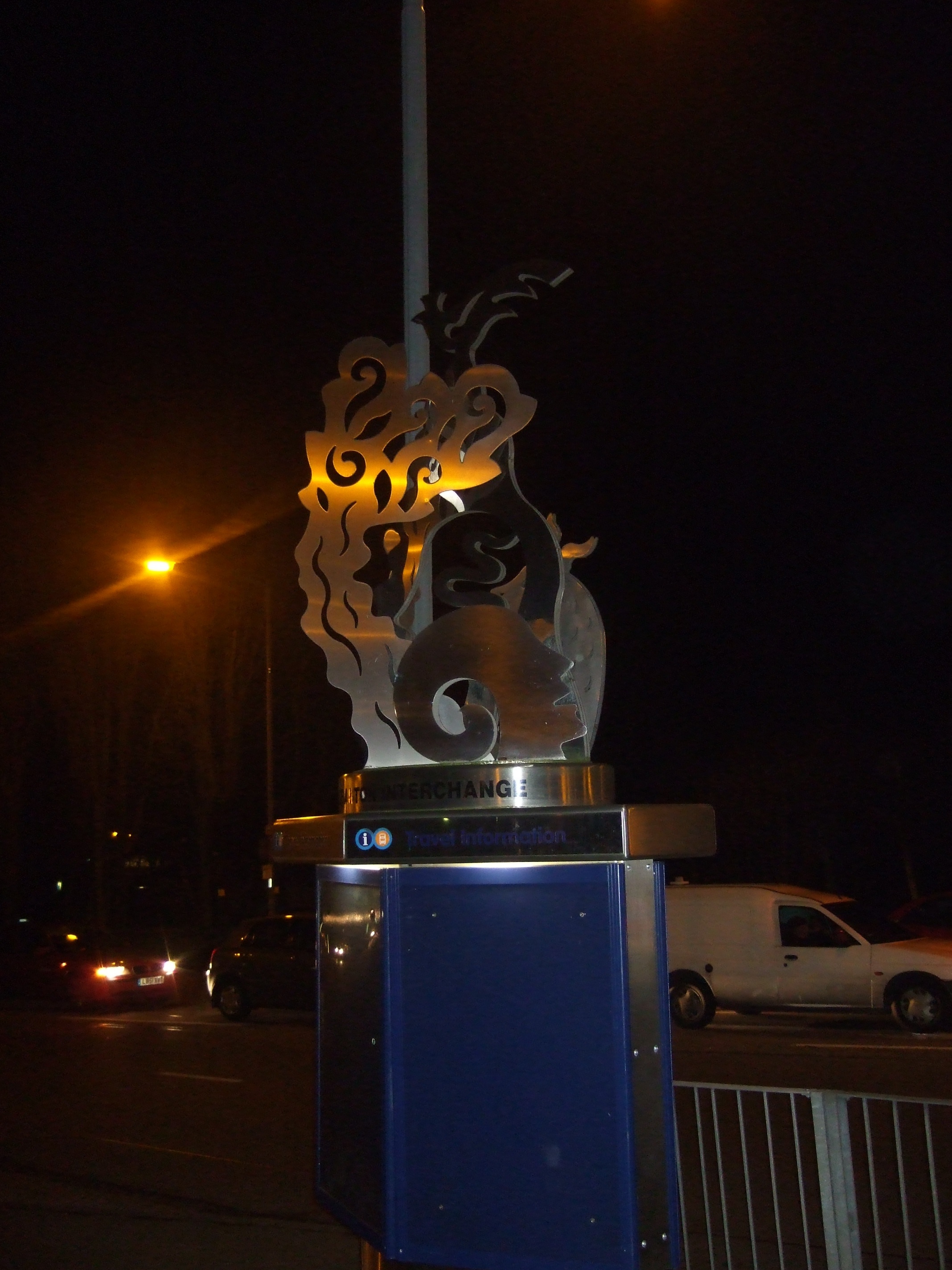 It's atop a bus information post. There appears to be a yelling head.