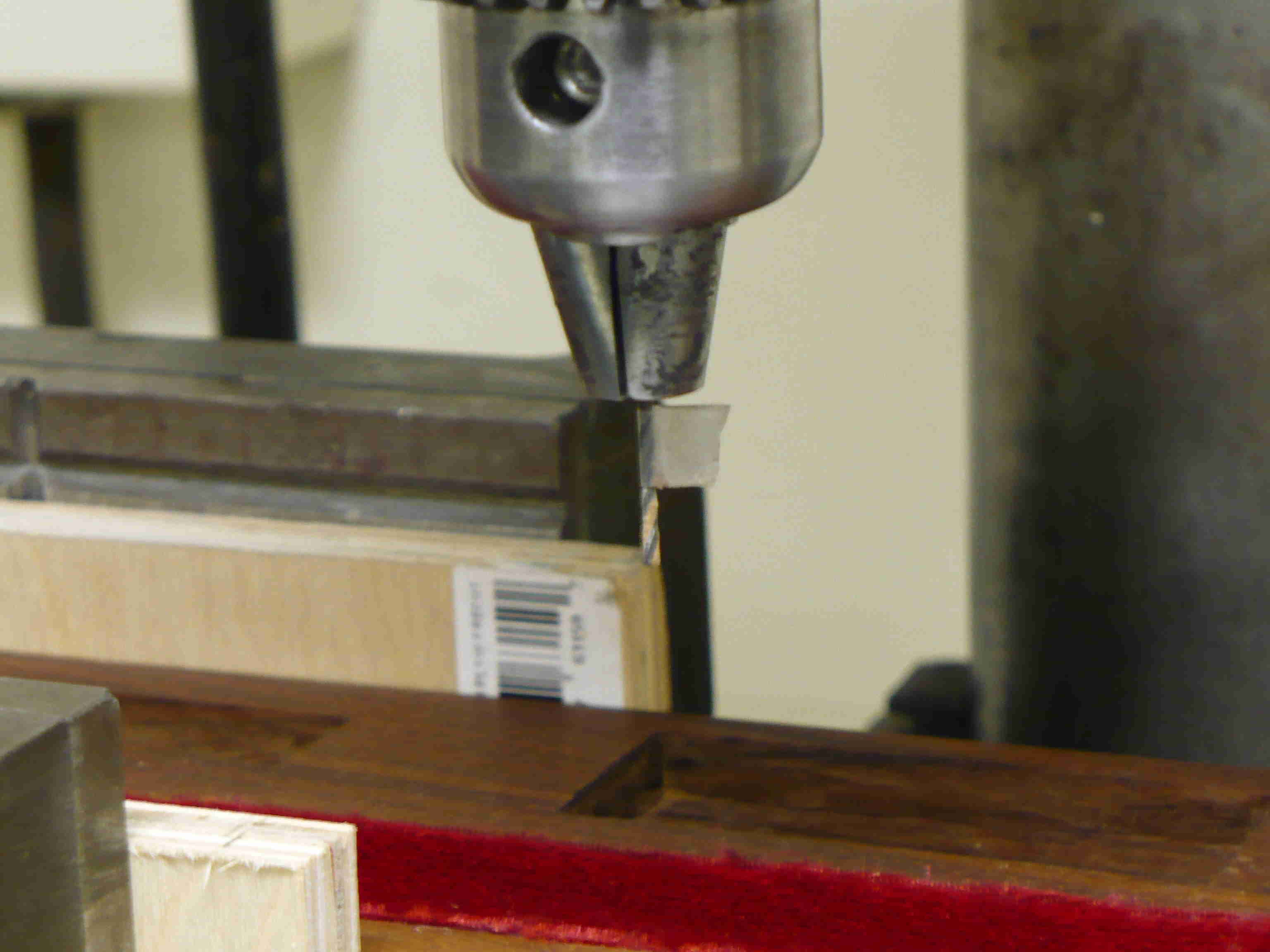 download file And note the drill bit's width. There were about 10 full turns of the chuck key between the widths, and the chuck was extraordinarily hard to turn, so I couldn't do it by hand. The tape was a depth gauge. When it started sweeping away the sawdust around the hole, I knew I'd gone to the right depth. |