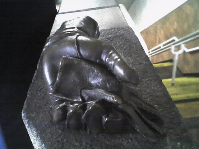 At the top of the escalator in Porter station, you'll see a large bronzed glove holding a small bronzed glove.