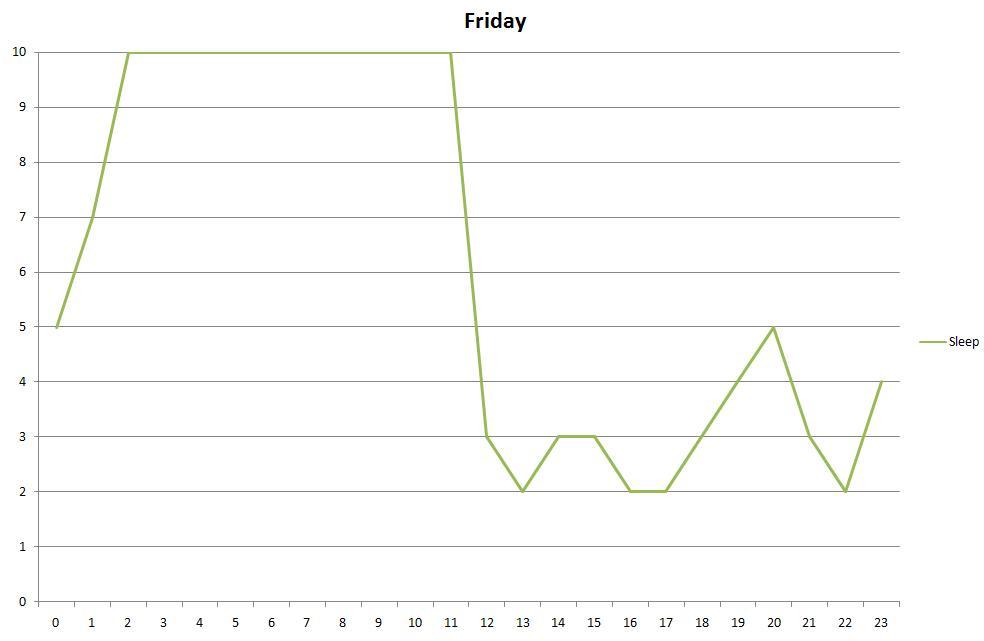 Desire for sleep across Friday - not sleeping as much as I was, and all in one go. Which is good.