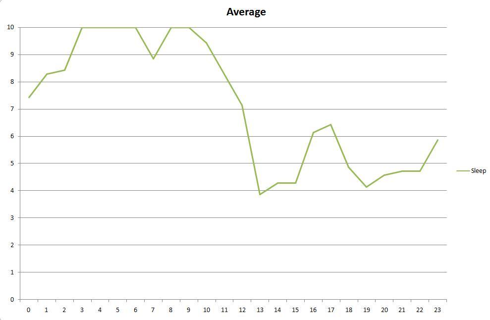 Desire for sleep across an average day shows I was always asleep between 3 and 6 and 8 and 9 in the morning, and I seem to want a light siesta around 5ish, which would explain the aforementioned drop.