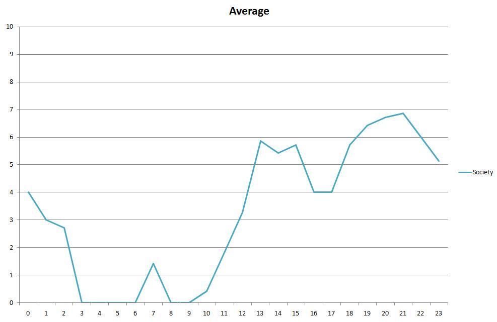 Desire for society is highest later in the evening, and probably higher than it should be at midnight.