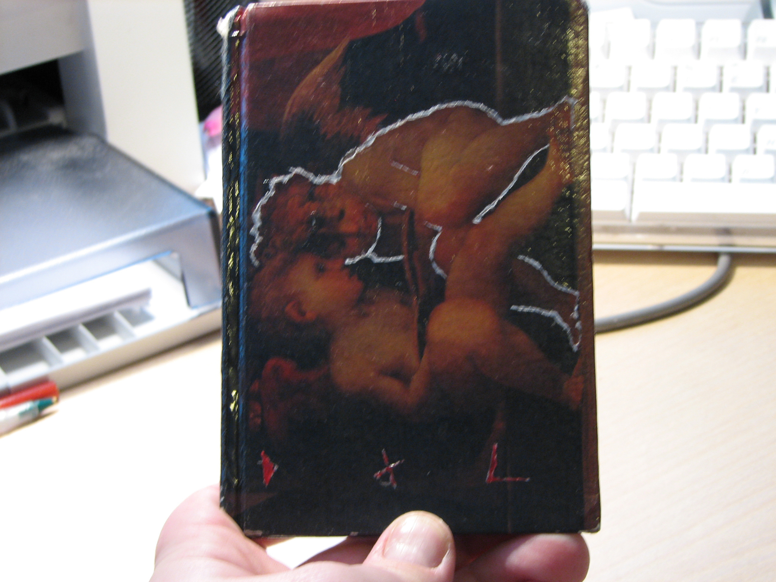 I scritched out these outlines of the cherubs and the D+L on the cover (both sides, btw) with a paper clip while riding the bus to work. I did this back in 2007.