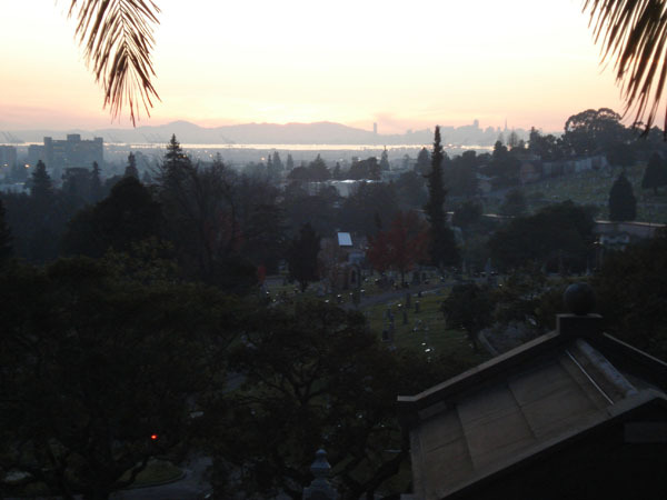 An attempt to photograph the most beautiful view of Sutro Tower, from the top of the Mountain View Cemetary in Oakland. The tower is located at that bright spot in the middle of the skyline... honest.