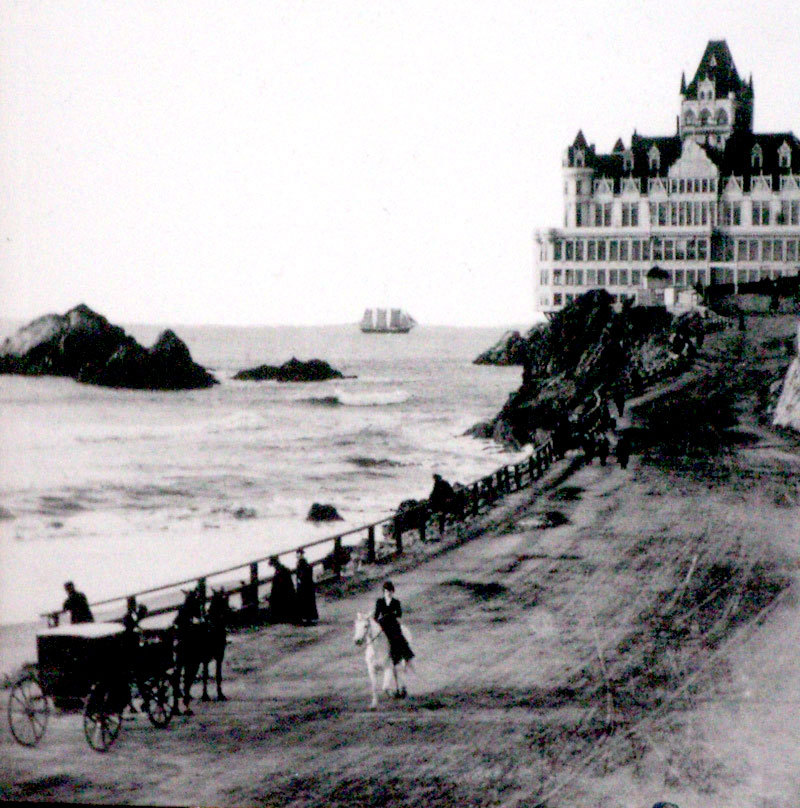 download file Close up of the picture on the cover. I have always loved this picture. There's just something about that horse. The picture is from sometime between 1896 and September 7, 1907 (now there's a set of numbers for you), when this, the 2nd Cliff house, burned to the ground after surviving the earthquake the previous year. (The book mistakenly lists it as the 3rd cliff house). |