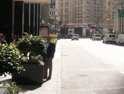 Montgomery Street facing Market and the new Palace Hotel in the distance, 2008. Now one way and no longer having its own railway.
