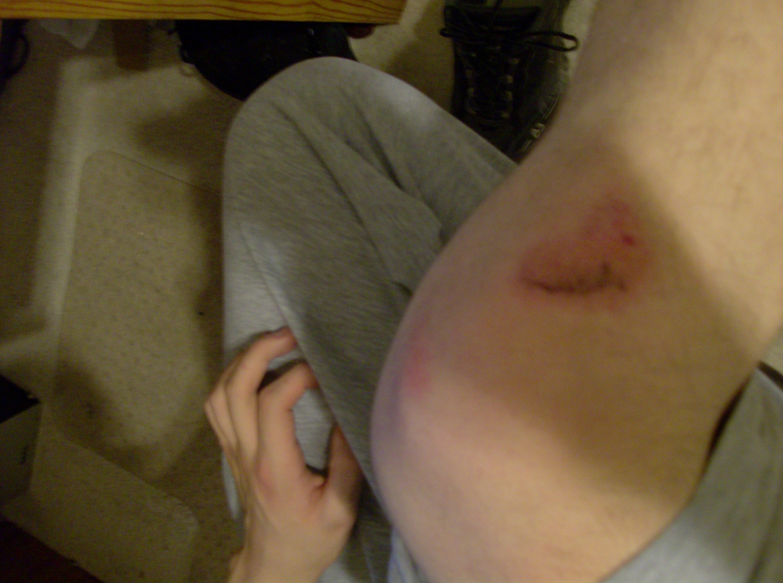 download file It hurts to straighten my limbs...>_> I didn't put anything on this one. The dark line at the top part of the wound isn't part of the scrape, its a bunch of jean fibers that got embedded into my skin and I'm too much of a wuss to pull them out right now. I think this will heal much quicker. It hurts but the skin damage isn't as bad as the one on my arm. I applied First Aid Cream at 10:00 PM. |