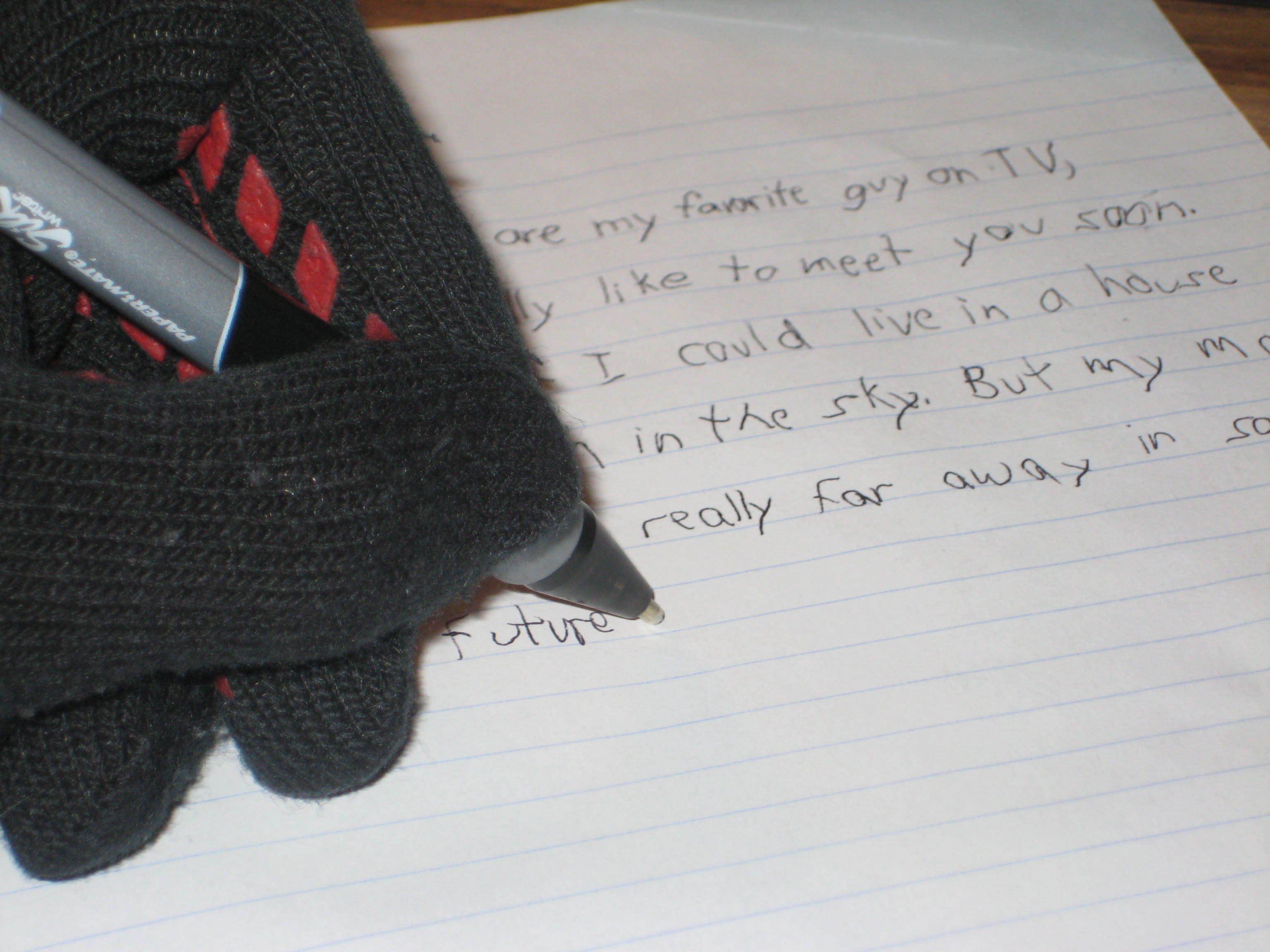 Here's George Jetson's letter in progress. Note the non-dominant left hand and the horrible penmanship.