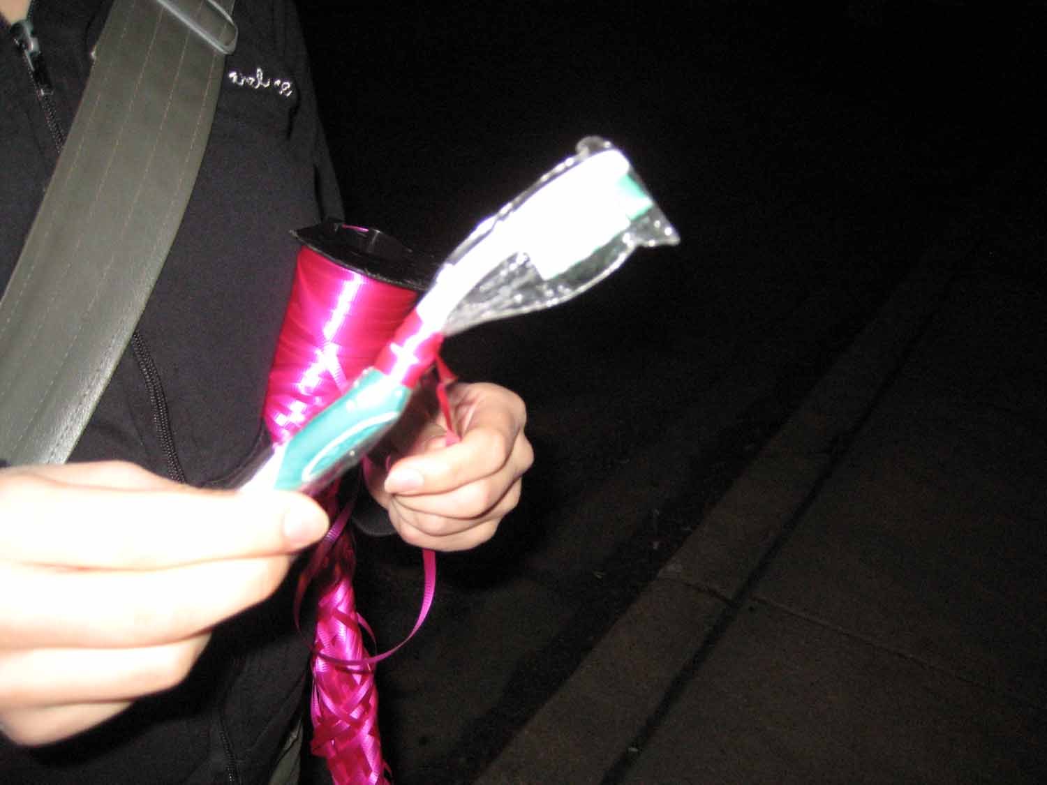 Fortunately, Muffinbot had a free sample toothbrush in her bag, just the right size to roll newly untangled prolapsed-rectal ribbon around.