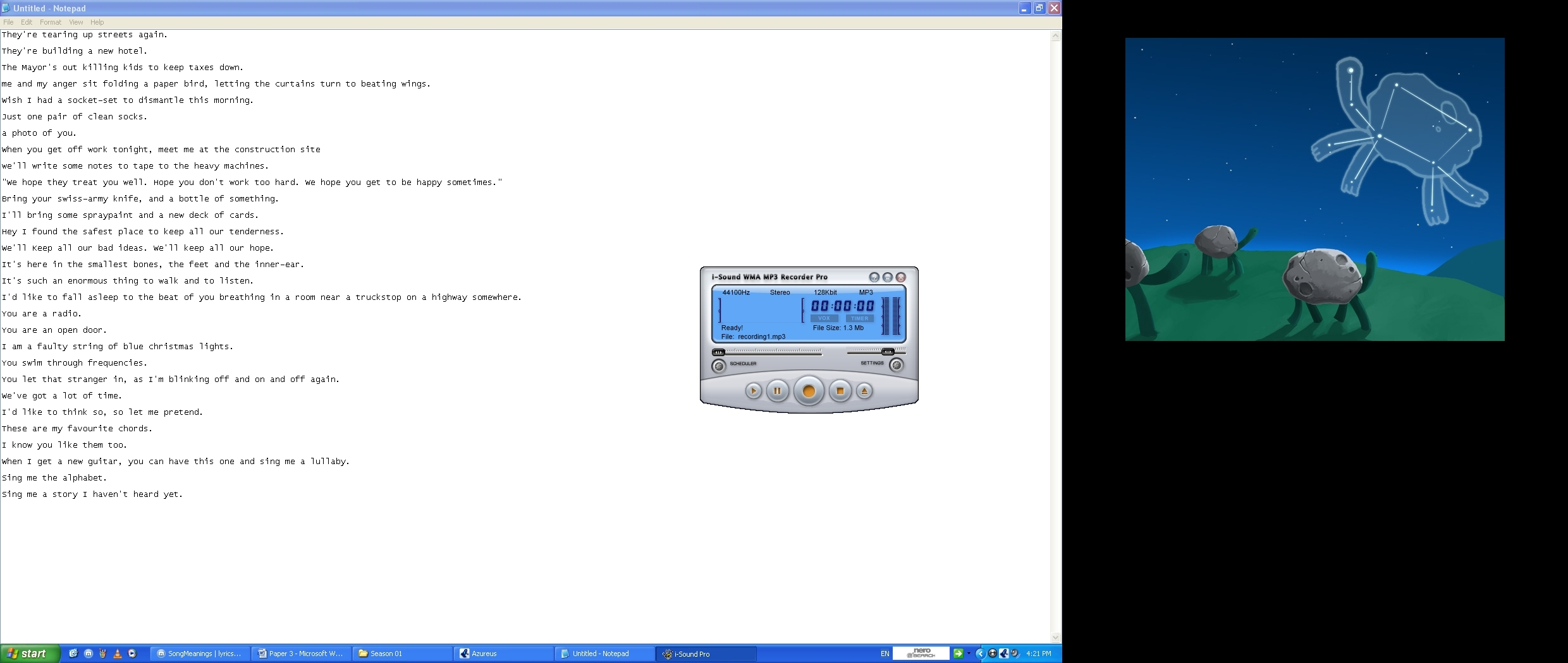 yikes! i forgot I had extended desktop on when print-screening thse lyrics. These are the lyrics used to record the file, as well as the recording program open.