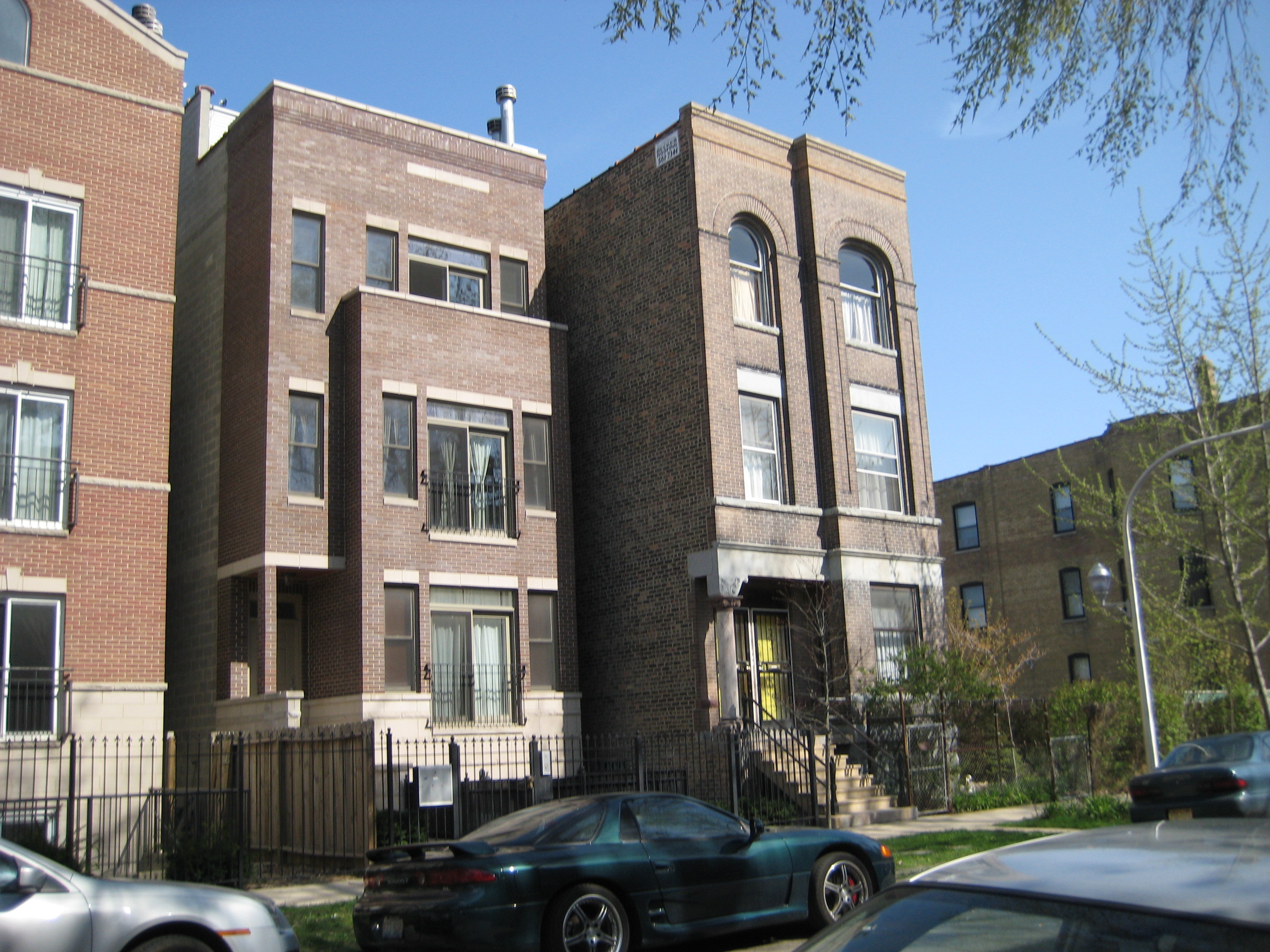 A new-construction brown brick building (center) tries to blend in next to an old-construction brown brick building (right).