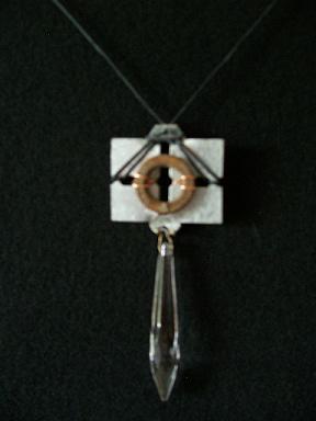 Yes, I found the chandelier crystal, too. The washer is attached with copper wire, and the hanging is an elegant double wrap.