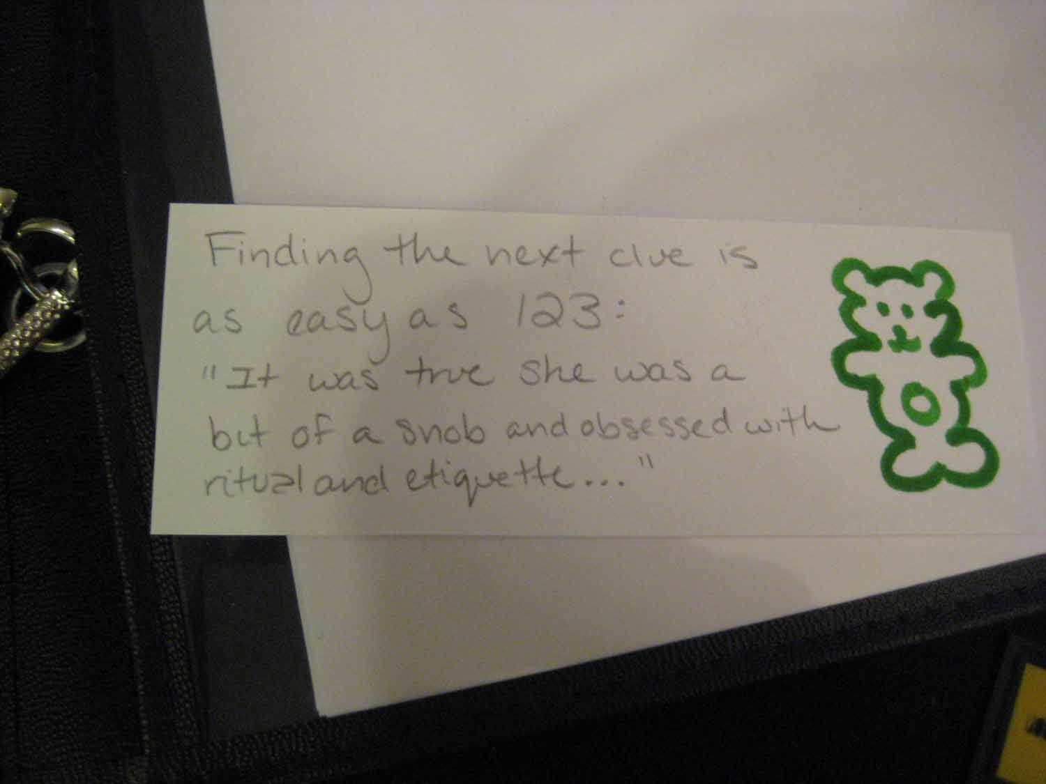 Finding the next clue is as easy as 123: "It was true she was a bit of a snob and obsessed with ritual and etiquette..."