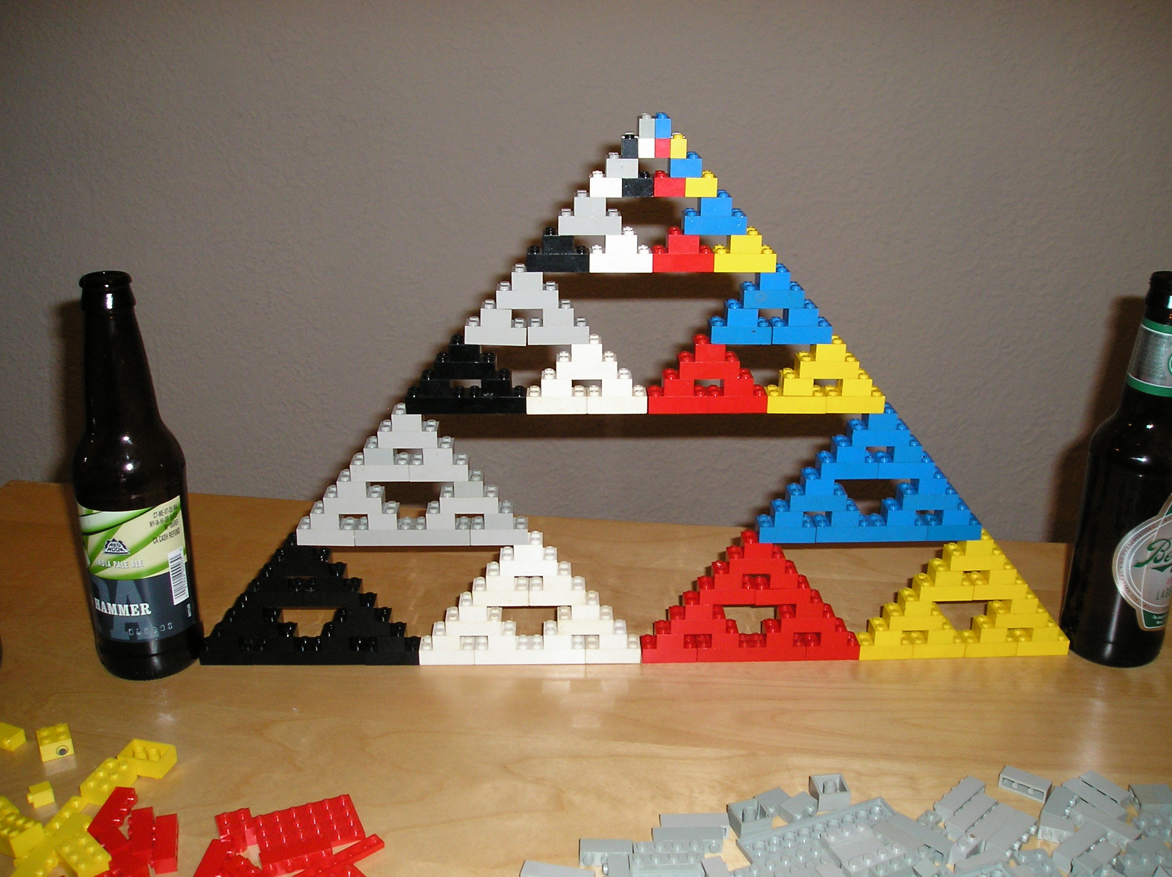 one night Mr. G took the flat SierpiĆski triangle out to several more iterations than i got to, as i was forming a hollow tetrahedron with mine, when i could have been stacking them.